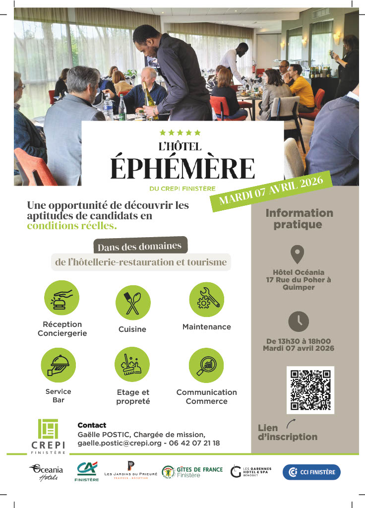 Mardi 7 avril – Quimper 13h – 18h (pour les candidats)13h30 – 18h (pour les pros)Lieu : Hôtel Océania Quimper (rue du Poher)Organisation : Crépi